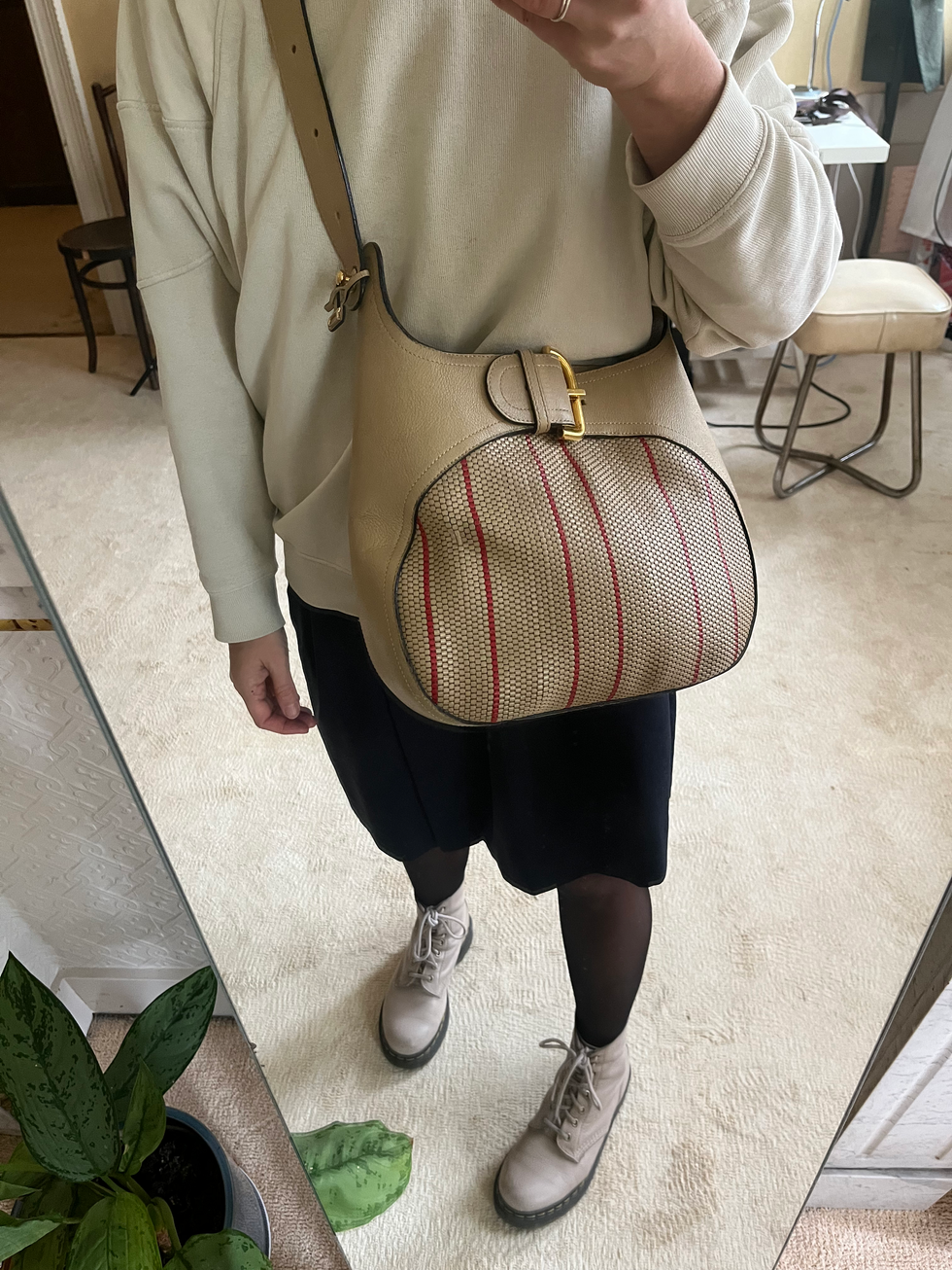 Deze tas in toile de cuir is een zeldzaam vintage exemplaar met een opvallend afgerond silhouet en kenmerkende gesp aan de voorkant. Hij is voorzien van een verstelbare schouderband en een magneetsluiting en opent naar een met suède gevoerde binnenkant. De handtas is de perfecte combinatie van functionaliteit, elegantie en vakmanschap. Een alledaagse tas om te stralen op deze grijze dagen.