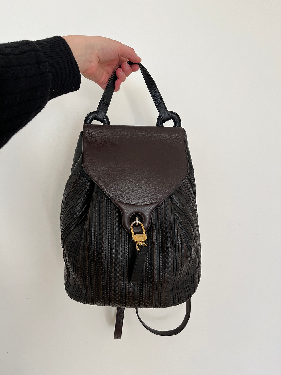 Deze tas is een ideaal model voor dagelijks gebruik. Hij heeft een ruim silhouet met dubbele leren koordhengsels aan de bovenkant en een riem met een voorvak. Binnenin sluit deze met een magneetknop.
